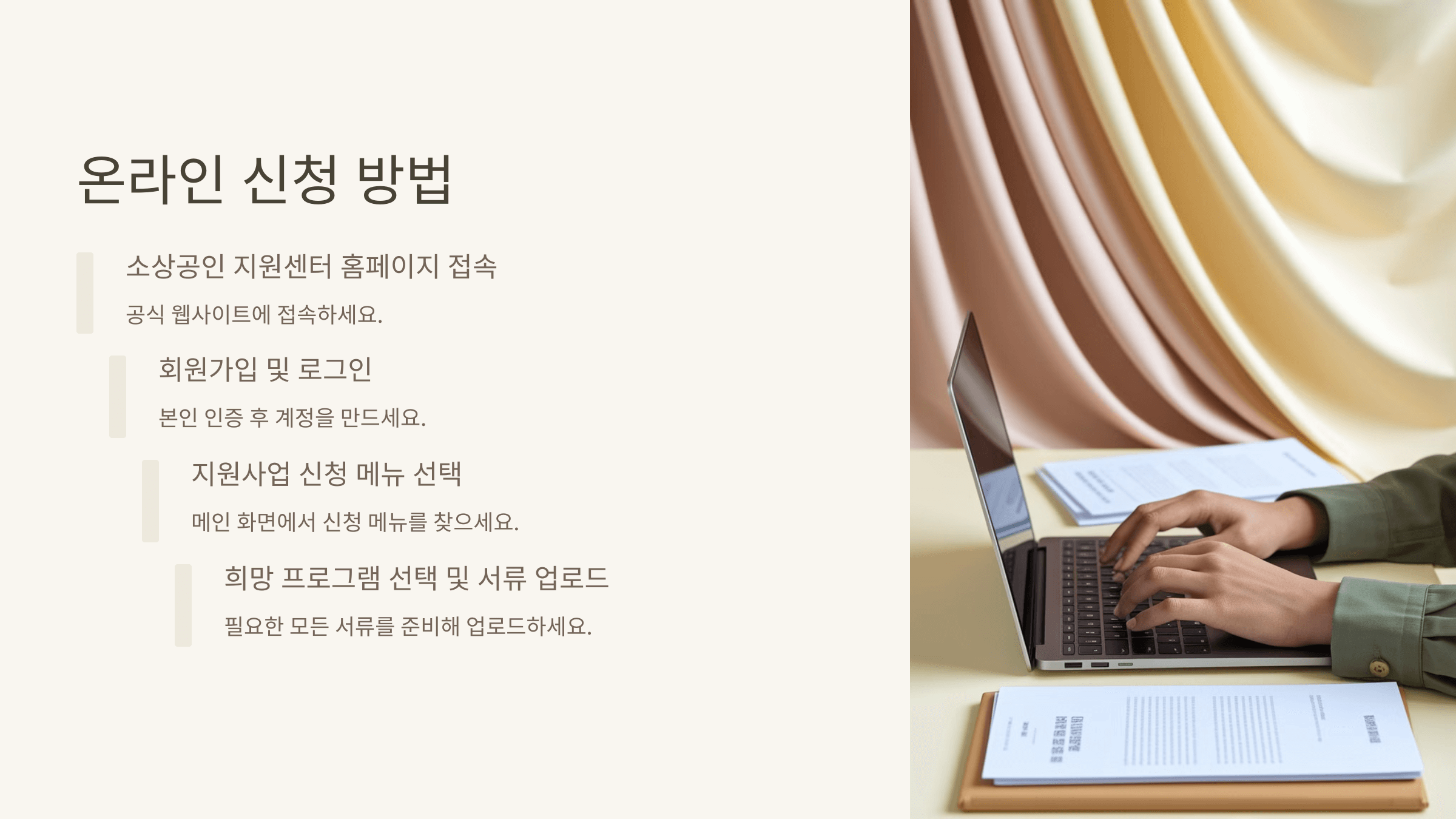 소상공인 지원금은 온라인과 오프라인 모두 신청 가능합니다. 아래는 각각의 절차입니다.