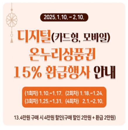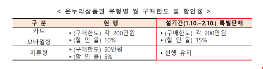설 명절 전후로 해서 총 한달간 (1월10일 ~ 2월10일) 1인당 200만원 한도에서 온누리상품권 15% 할인을 해줍니다.