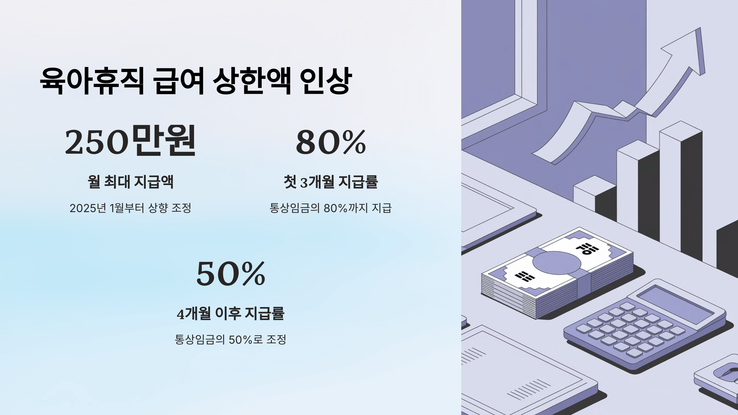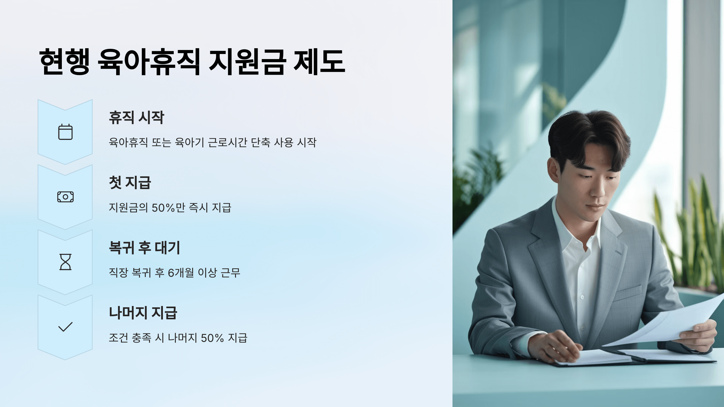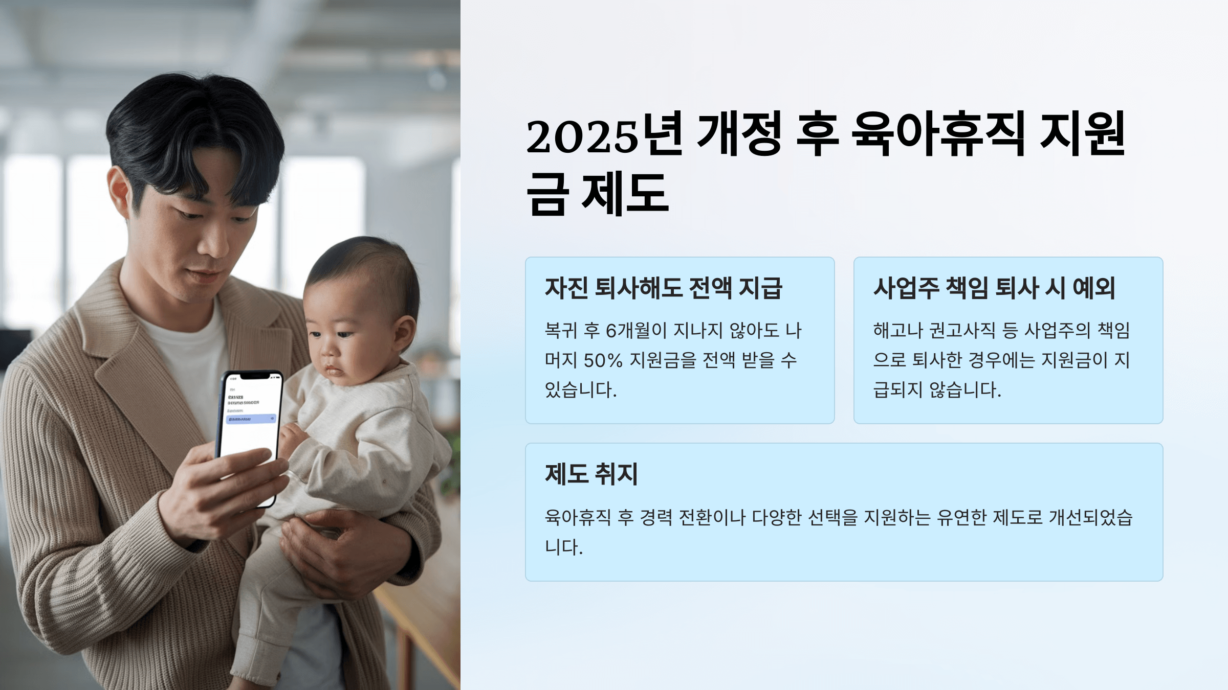 - 개정 후에는 복귀 후 6개월이 지나지 않아도 자진 퇴사 시 나머지 절반의 육아휴직 지원금을 전액 받을 수 있게 됩니다.