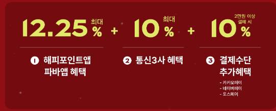 해피포인트앱 파바앱 혜택 12.25%(최대) + 통신3사 혜택 10 %(최대) + 결제수단 추가혜택 (카카오페이, 네이버페이, 토스페이) 10%(2만원 이상 결제시)최대 32.25% 할인을 받으실수 있습니다.