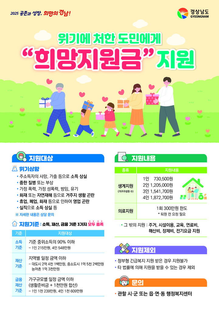경남도는 올해 처음 도입한 '희망지원금' 사업을 통해 현행 법·제도적 지원에서 제외된 저소득 가구 중 주 소득원의 실직, 폐업, 사망, 질병 등으로 위기에 처한 가구에 생계비, 의료비, 주거비 등을 지원하고 있습니다.