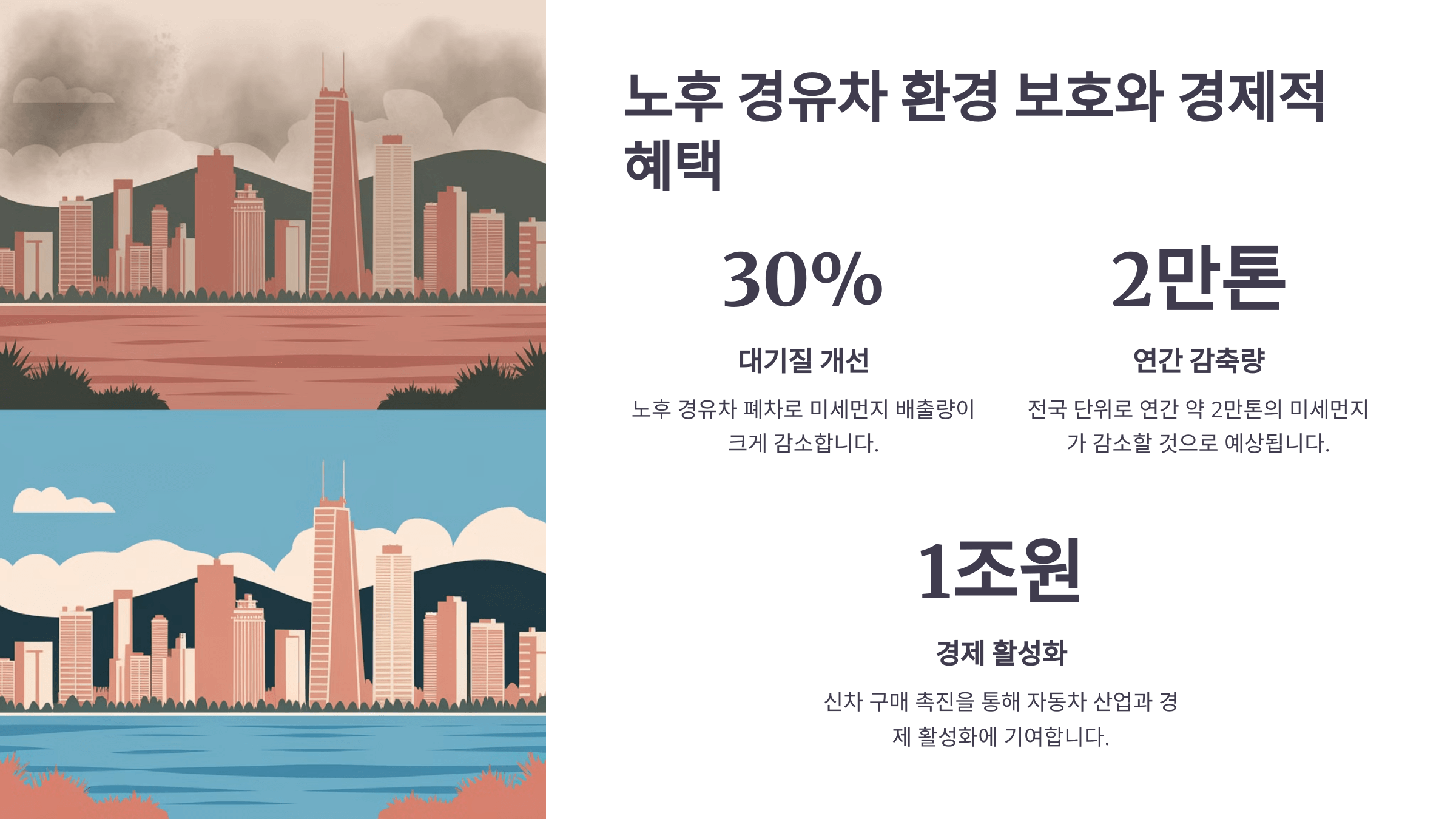 노후 경유차 조기폐차 지원은 대기오염을 줄이고, 친환경 차량으로의 전환을 촉진하기 위한 정부의 정책입니다. 특히, 배출가스 4등급 및 5등급 경유차를 대상으로 하여 보조금을 지원합니다. 이러한 제도는 환경 보호와 운전자 혜택을 동시에 제공하는 중요한 역할을 합니다.